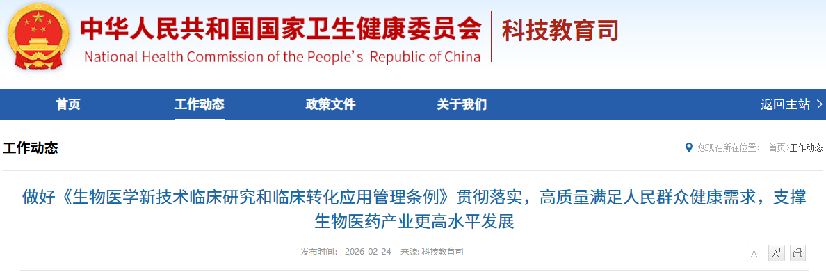 友康生物818条例5月即将施行!2026年2月24日,国家卫生健康委发布一则重要工作动态:做好《生物医学新技术临床研究和临床转化应用管理条例》贯彻落实,高质量满足人民群众健康需求,支撑生物医药产业更高水平发展。重点信号有哪些?